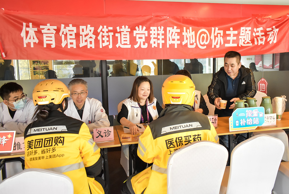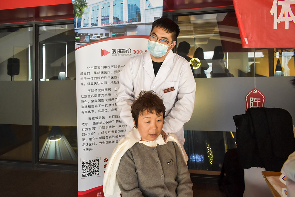 活动现场气氛热烈。除了向小哥们发放内含理发券、餐饮券的“能量补给包”外,主办方精心设置的“暖新服务角”成为了活动的一大亮点。其中,北京崇文门中医医院派出的专业医护团队为前来参与活动的快递、外卖从业者提供了免费的中医健康咨询、基础身体检查以及特色中医按摩服务。
